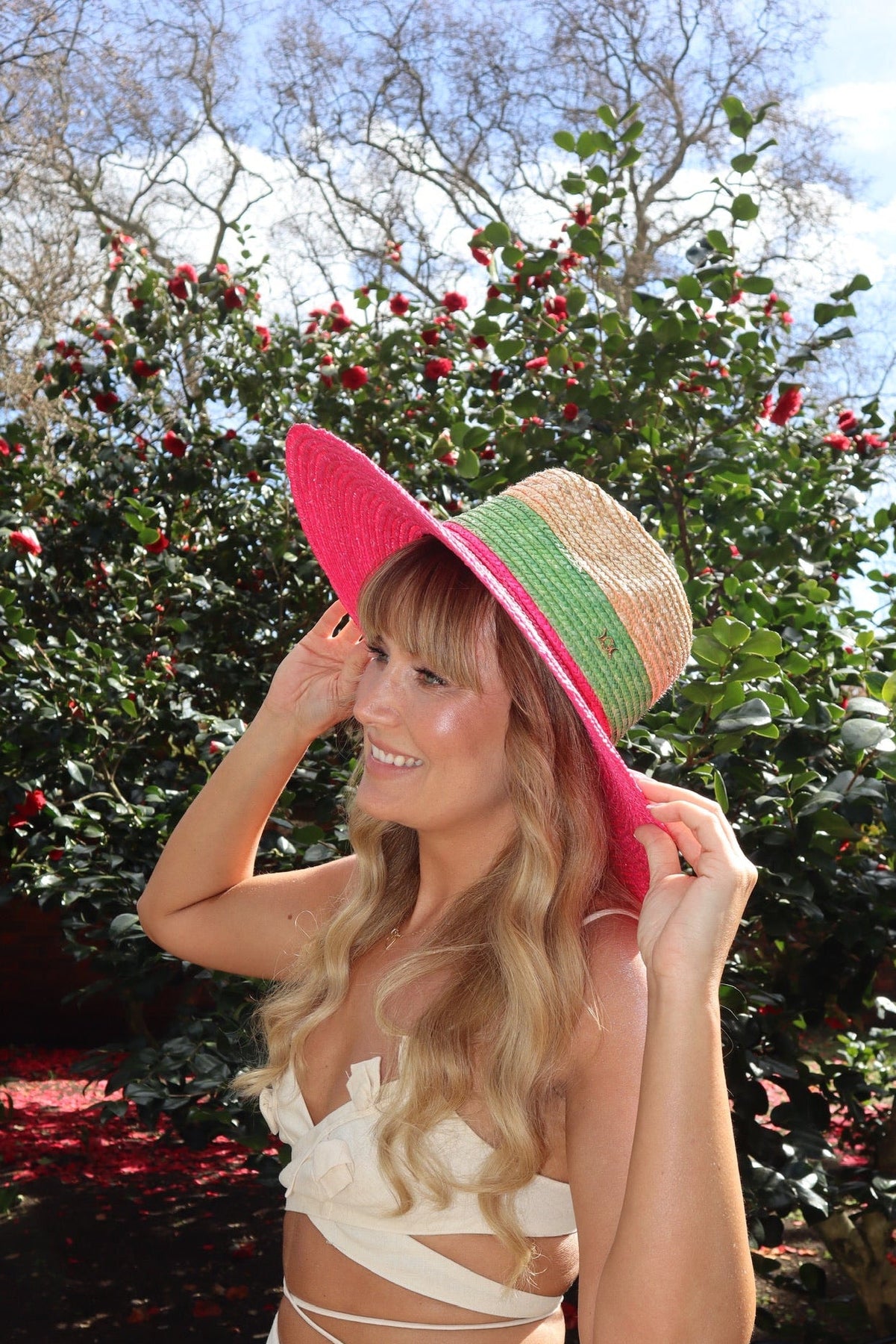Maya is a bold statement straw hat featuring a hot pink brim and bright green detailing, finished with an internal adjustable fit (56–58cm) for effortless summer glamour.